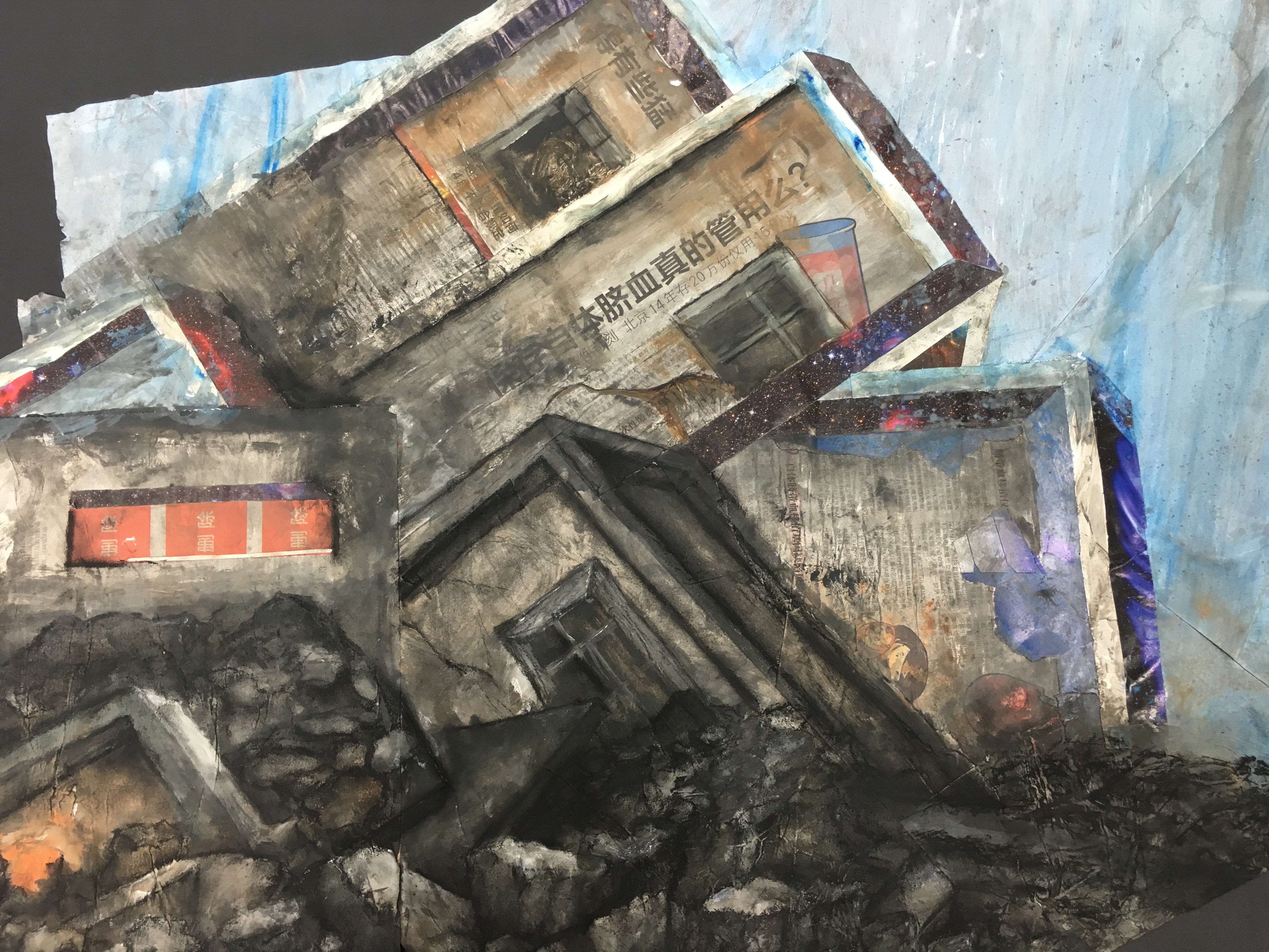 "Broken Things" is a series of acrylic paintings combined with collage to portray broken-down architectural structures.